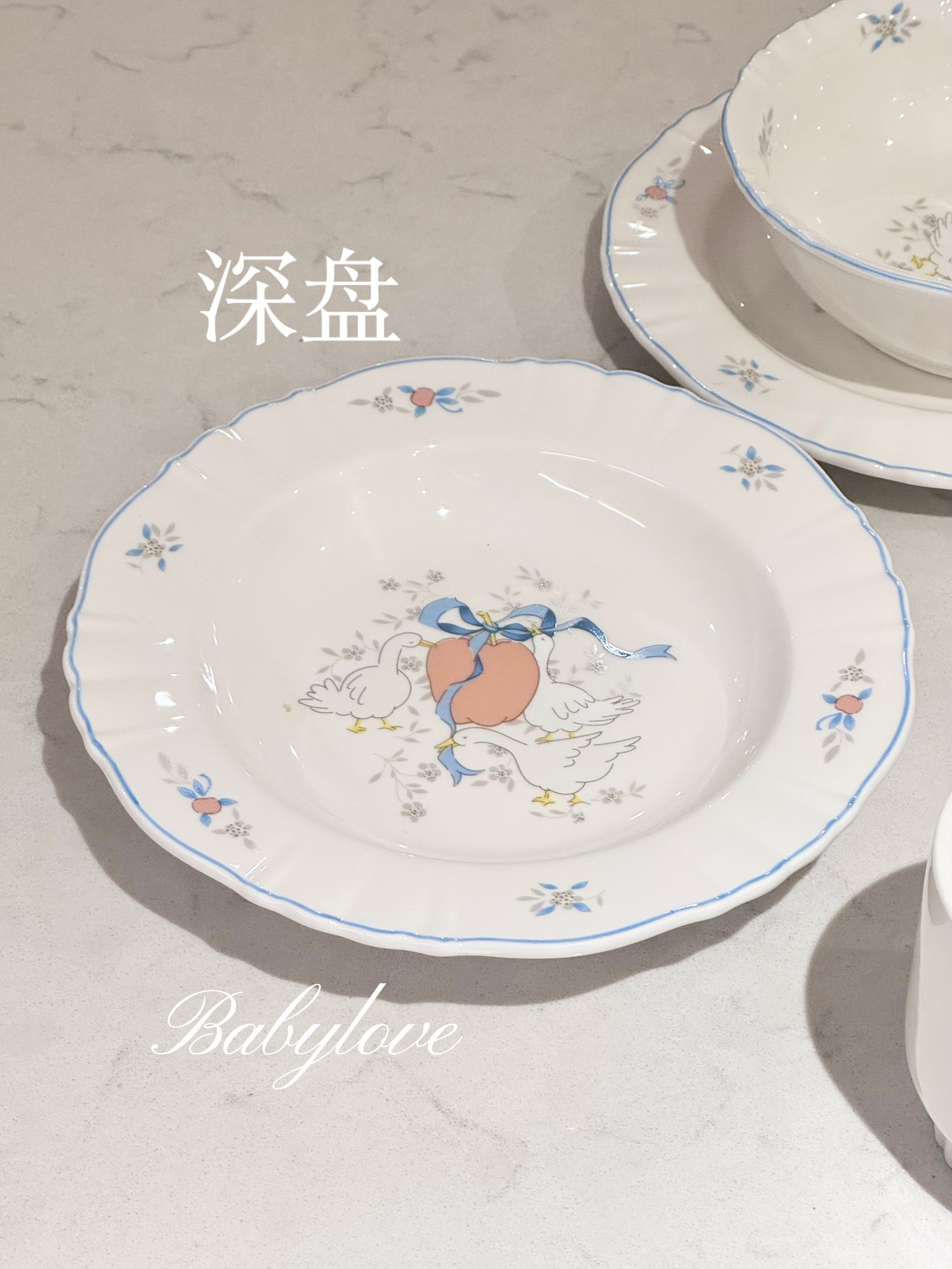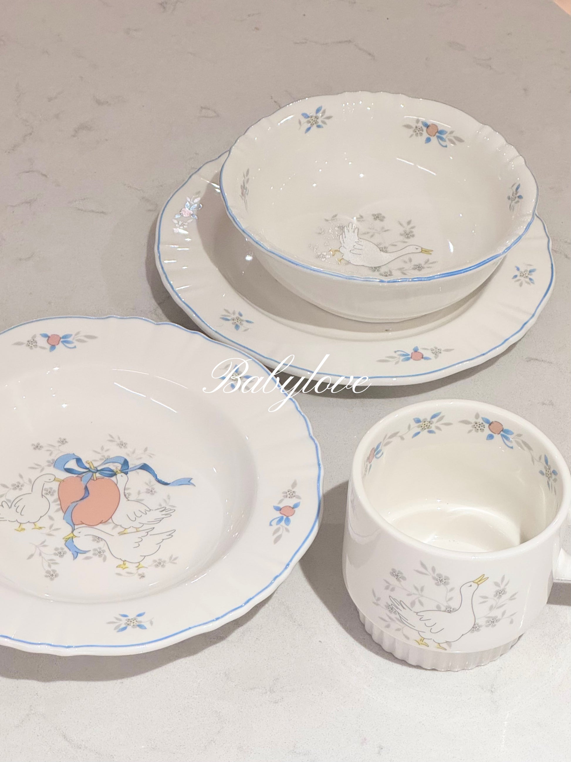 Bring a touch of vintage charm to your dining table with this beautifully crafted ceramic tableware set. Featuring delicate blue floral patterns and adorable goose illustrations, each piece is accented with a soft scalloped edge and fine blue rim for a refined, country-inspired look. Perfect for both everyday meals and special occasions.