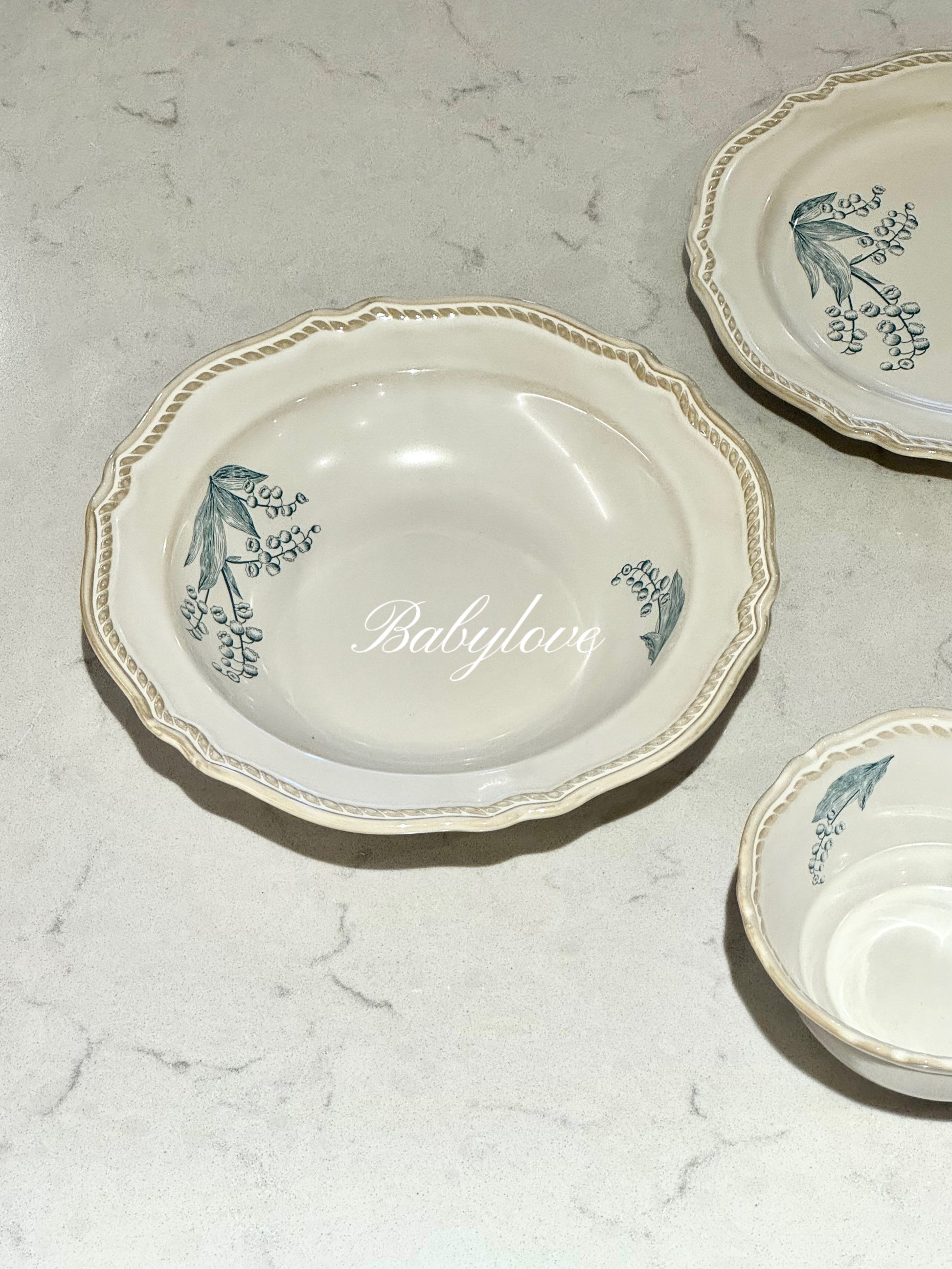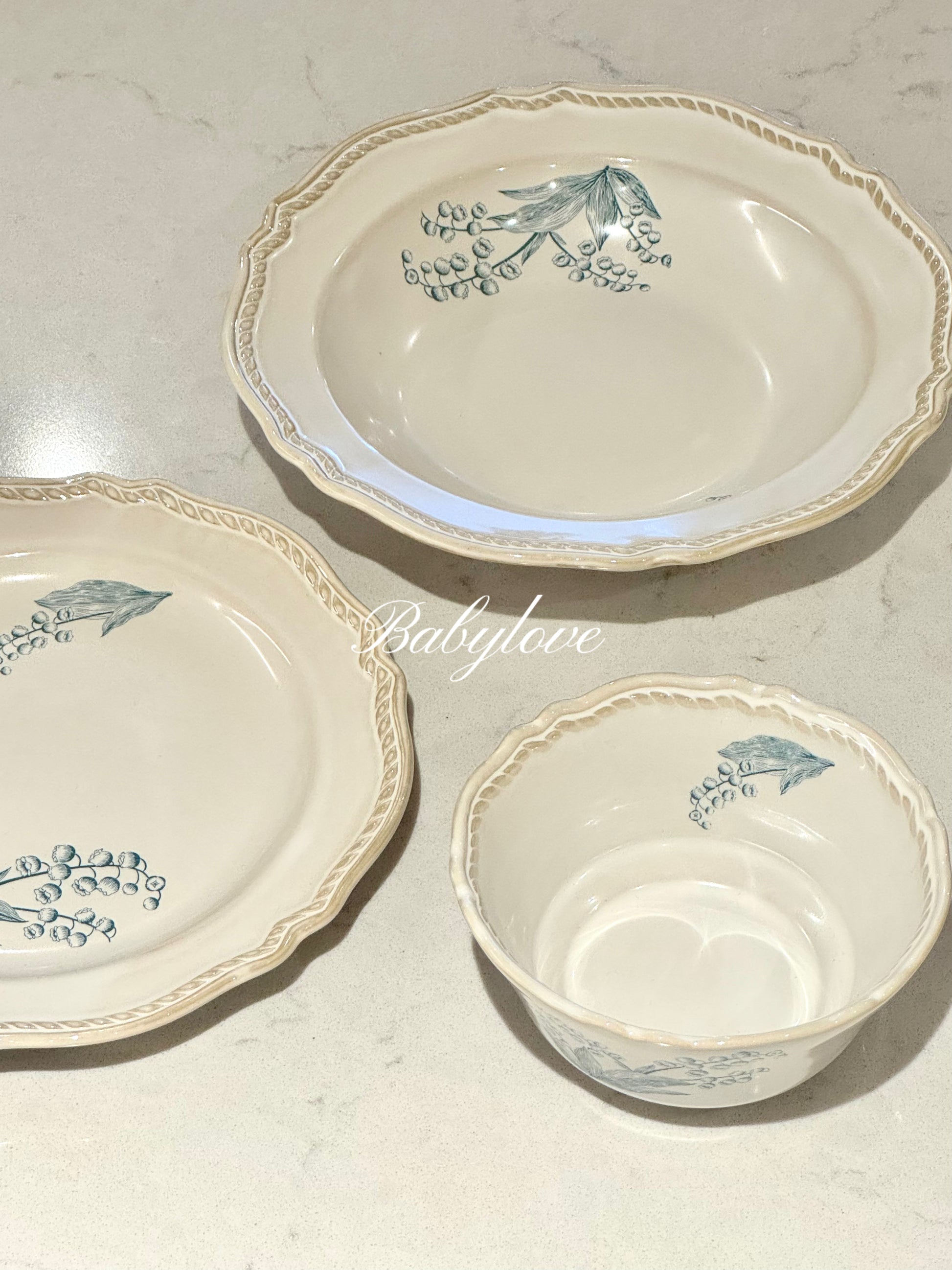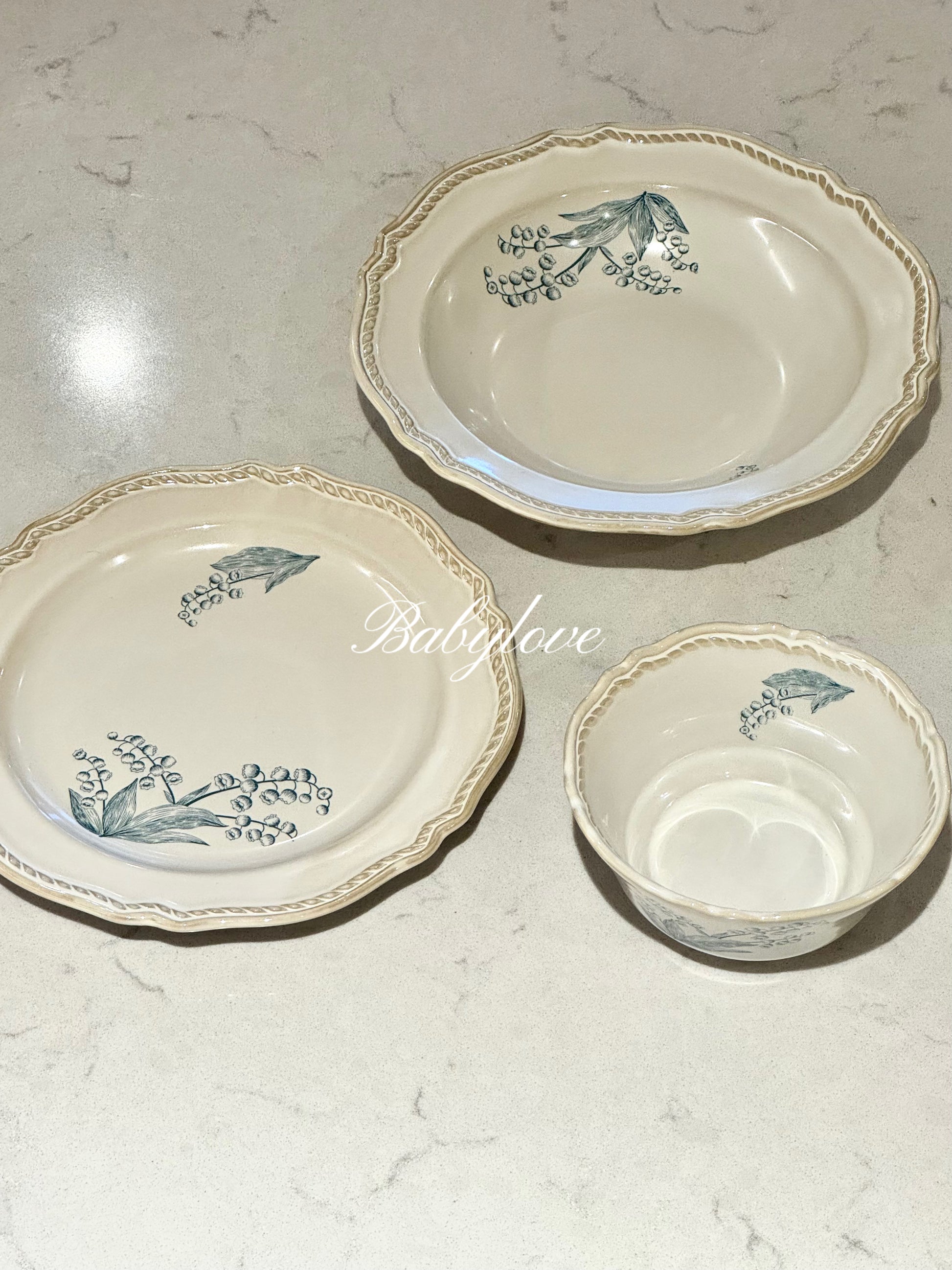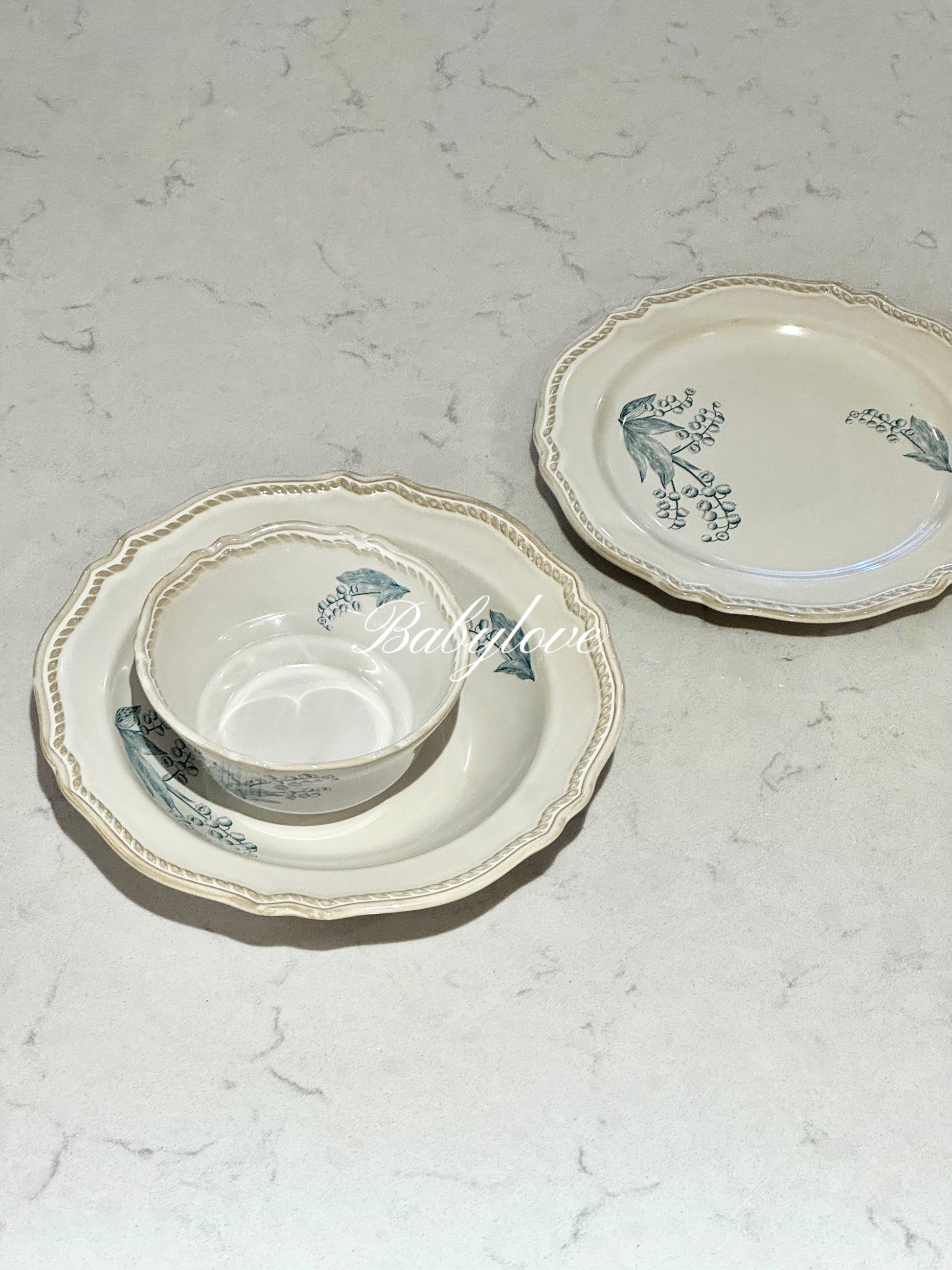 Bring refined elegance to your dining table with this palace-inspired ceramic tableware set. Delicately adorned with hand-painted lily of the valley motifs and framed by intricate embossed edges, each piece exudes a timeless, aristocratic charm. Perfect for those who appreciate romantic, vintage aesthetics and graceful dining experiences.