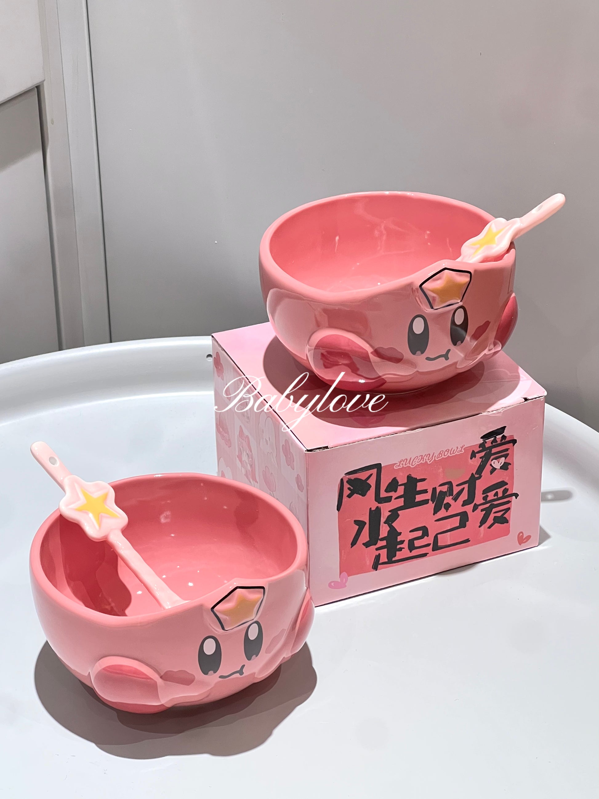 Pink Kirby-Inspired Ceramic Bowl with Star Spoon – Cute Anime Tableware